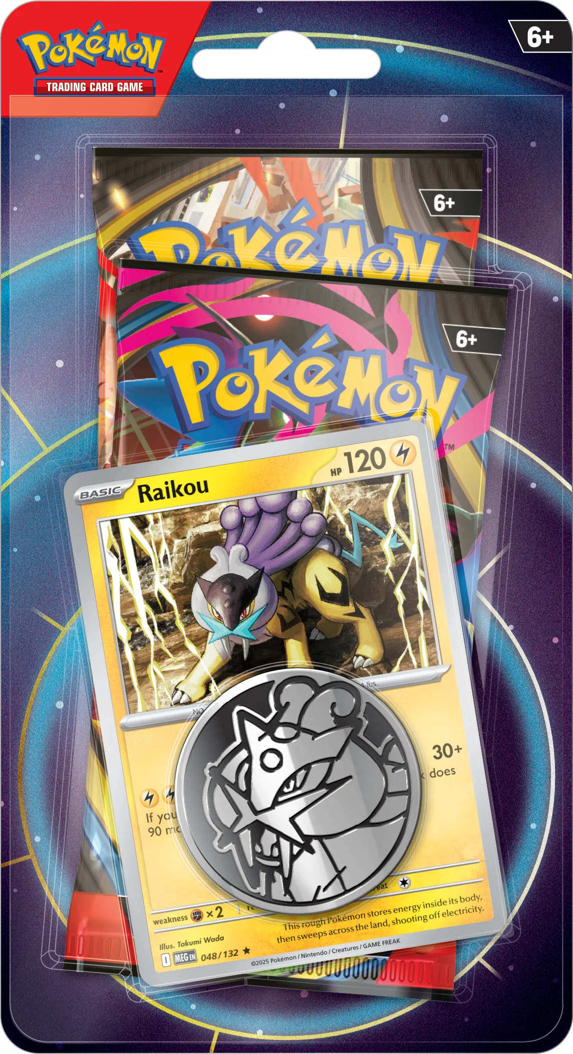 Quoi qu'il en soit le contenu est identique, soit : 2 boosters, 1 pièce et une carte Raikou (MEG 048) en version holo cosmo.